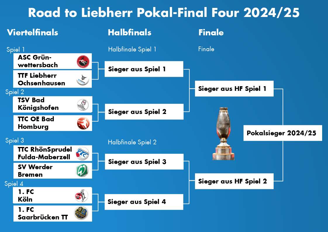 Erneut auf den Sprung in das Liebherr Pokal-Final Four hoffen die TTF Liebherr Ochsenhausen und der ASC Grünwettersbach. Beide Teams waren in der vergangenen Saison jeweils bis in das Halbfinale gekommen. In diesem Jahr kommt es bereits im Viertelfinale zum direkten Duell der beiden Mannschaften mit Heimvorteil für den ASC Grünwettersbach.